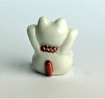 Weiß, Rot, Gold und Schwarz. Diese liebevoll gestaltete Keramikfigur einer sitzenden weißen Katze ist ein echtes Highlight für jeden Katzenliebhaber. Die Figur zeigt die Katze dabei, wie sie beide Pfoten in die Luft streckt und mit einem rot-goldenen Halsband geschmückt ist.