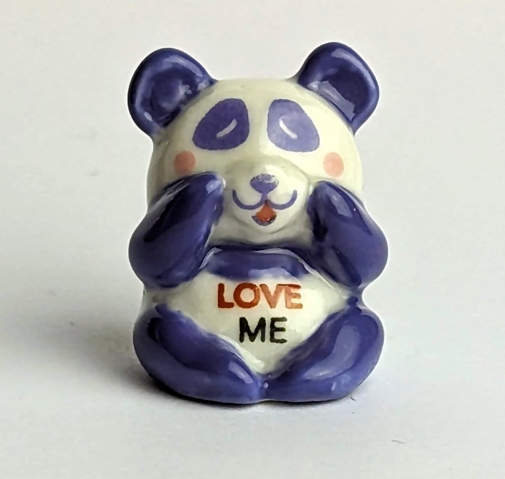 Die künstlerische Gestaltung und die detailreiche Bemalung machen jede Figur zu einem Unikat. Der Panda sitzt entspannt da, was ihn besonders anschaulich und sympathisch macht. Die lila-weiße Farbgebung und die Botschaft "Love Me" lassen die Figur besonders niedlich und ansprechend erscheinen.